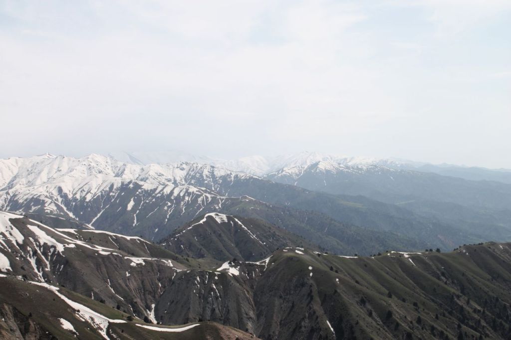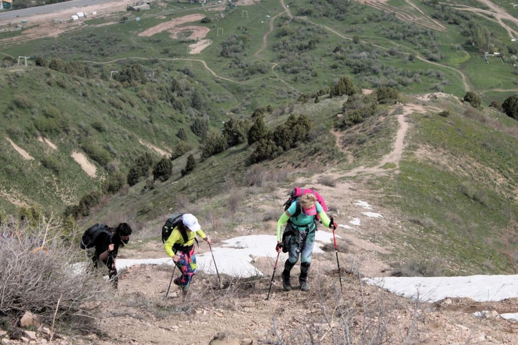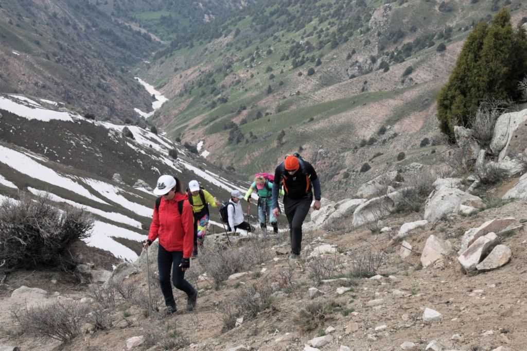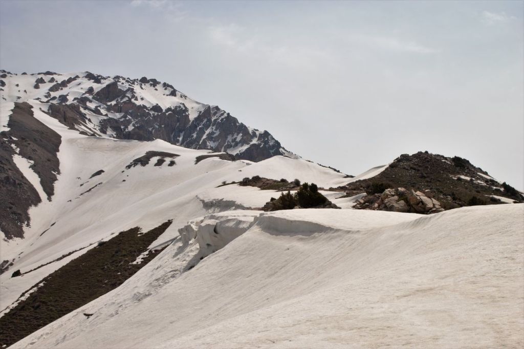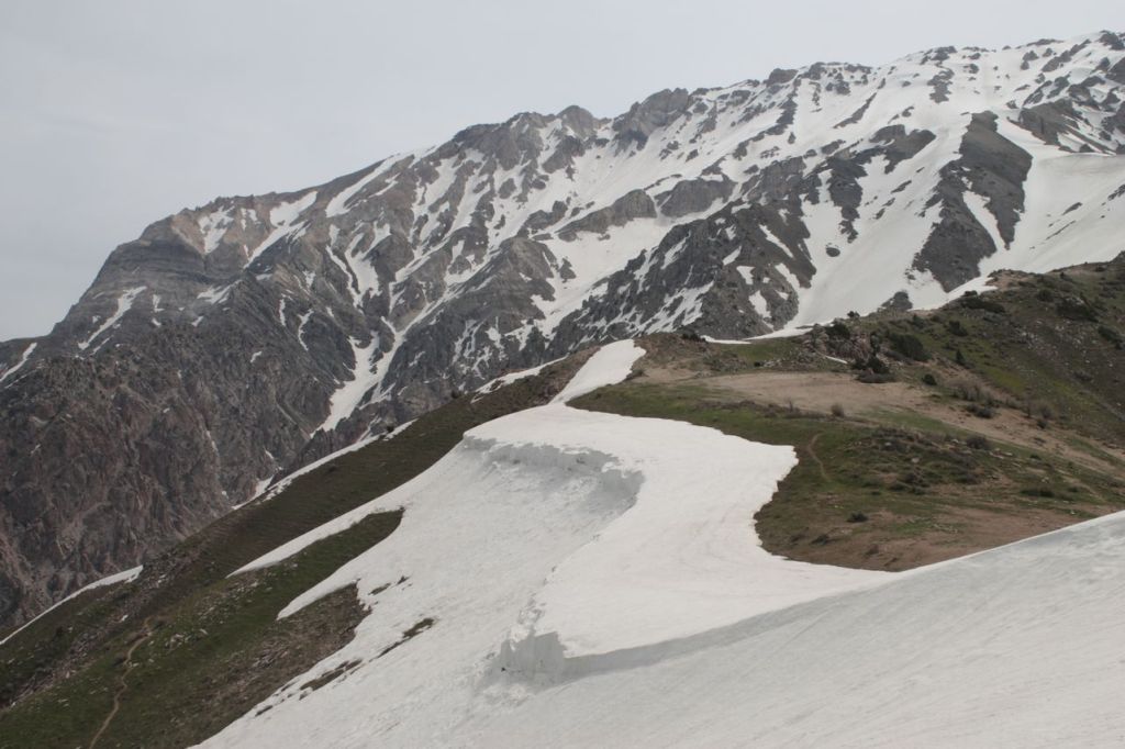 This day starts with the climbing on western ridge of Big Chimgan (~2500m). There is a lot of snow yet on this height but first flowers appeared already. Further our way laid down to the Beldersay river. This path goes through risky pass called “Ochkovy Isthmus”. It is the main goal of this trip – cross narrow steep pass. Most of the people cross it quietly but for some of us it can become insurmountable barrier. How many emotions even tears! But all overcame, bravo!