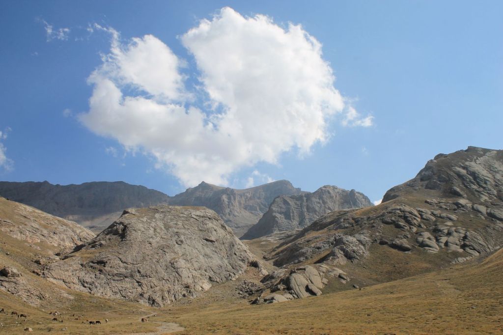 The first stage of the route was an almost continuous steep climb. Then the path became gentler, but in places it was very narrow, with rocky scree, so there was no time to relax. The heat was gone, and there was a strong wind in places, so I had to put on a windbreaker. It was so strange to meet two shepherds sitting on their haunches and wearing T-shirts on the pass.