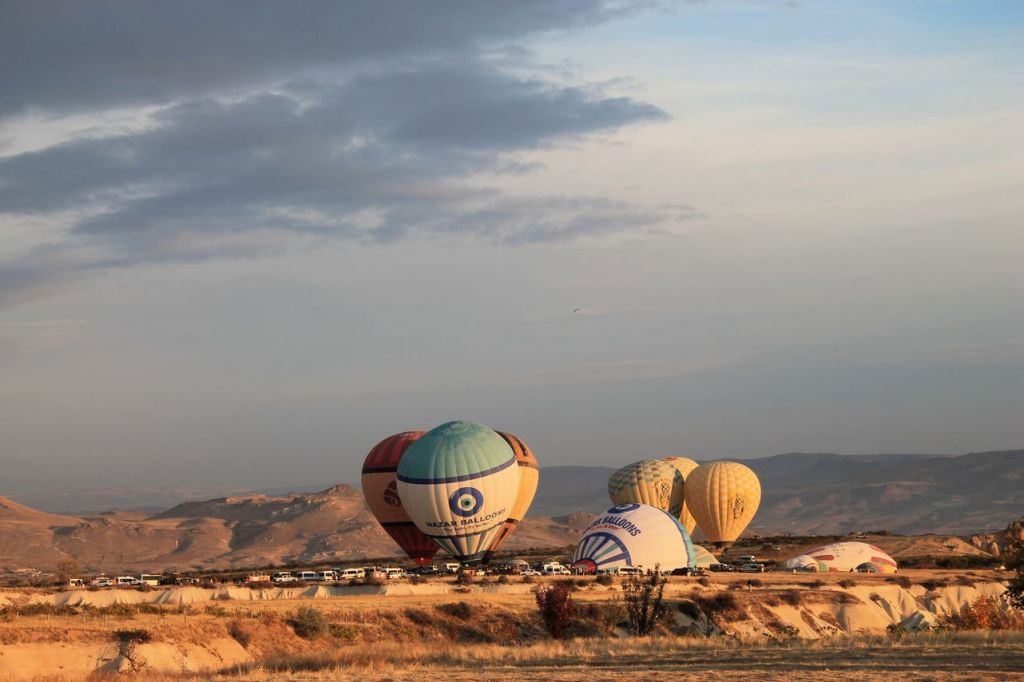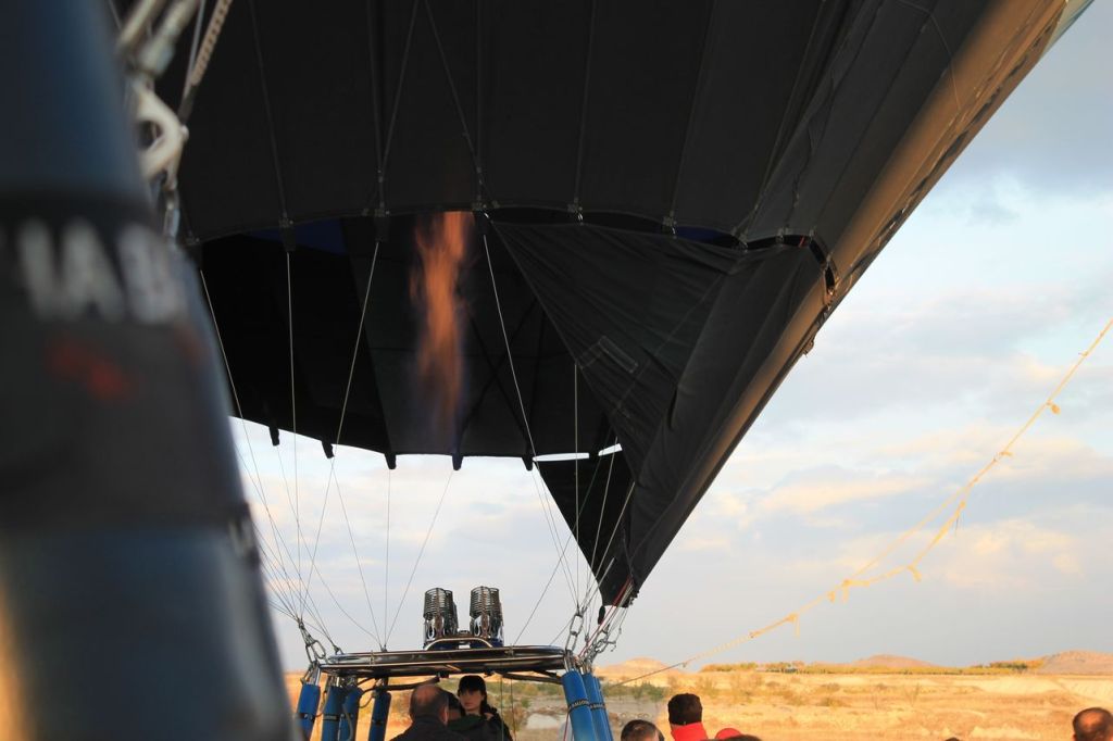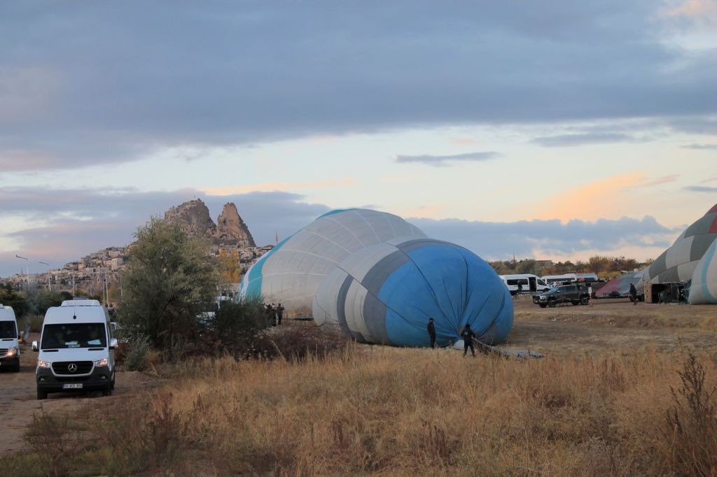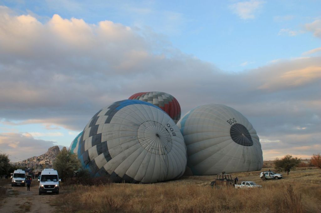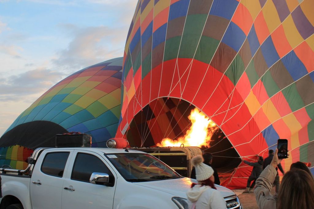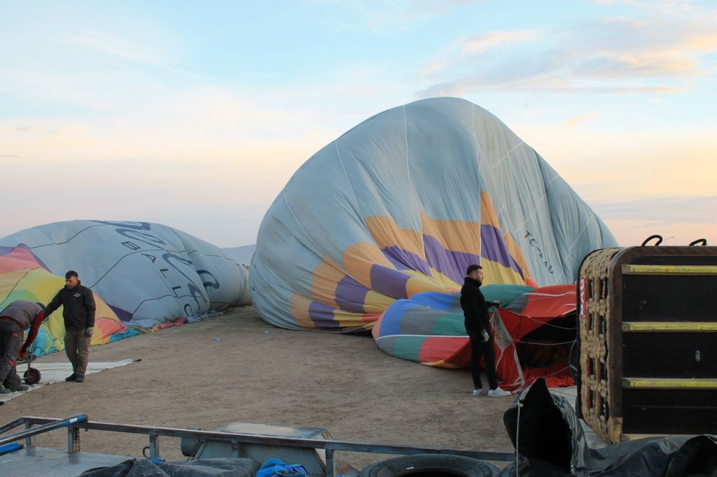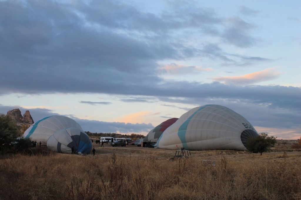 We woke up early in the morning. Pick up time was at 4:45 am. Start point was not far from our hotel. When we reached the start point the weather conditions was unstable. And then it started to rain. We began to think that the flight would not take place, but the rain quickly stopped. Then the clouds began to disperse, and dawn broke. Out of the darkness around us, many more launch sites appeared around our location, and everyone began to bustle about – cars with platforms arrived, and the balloons began to be inflated.